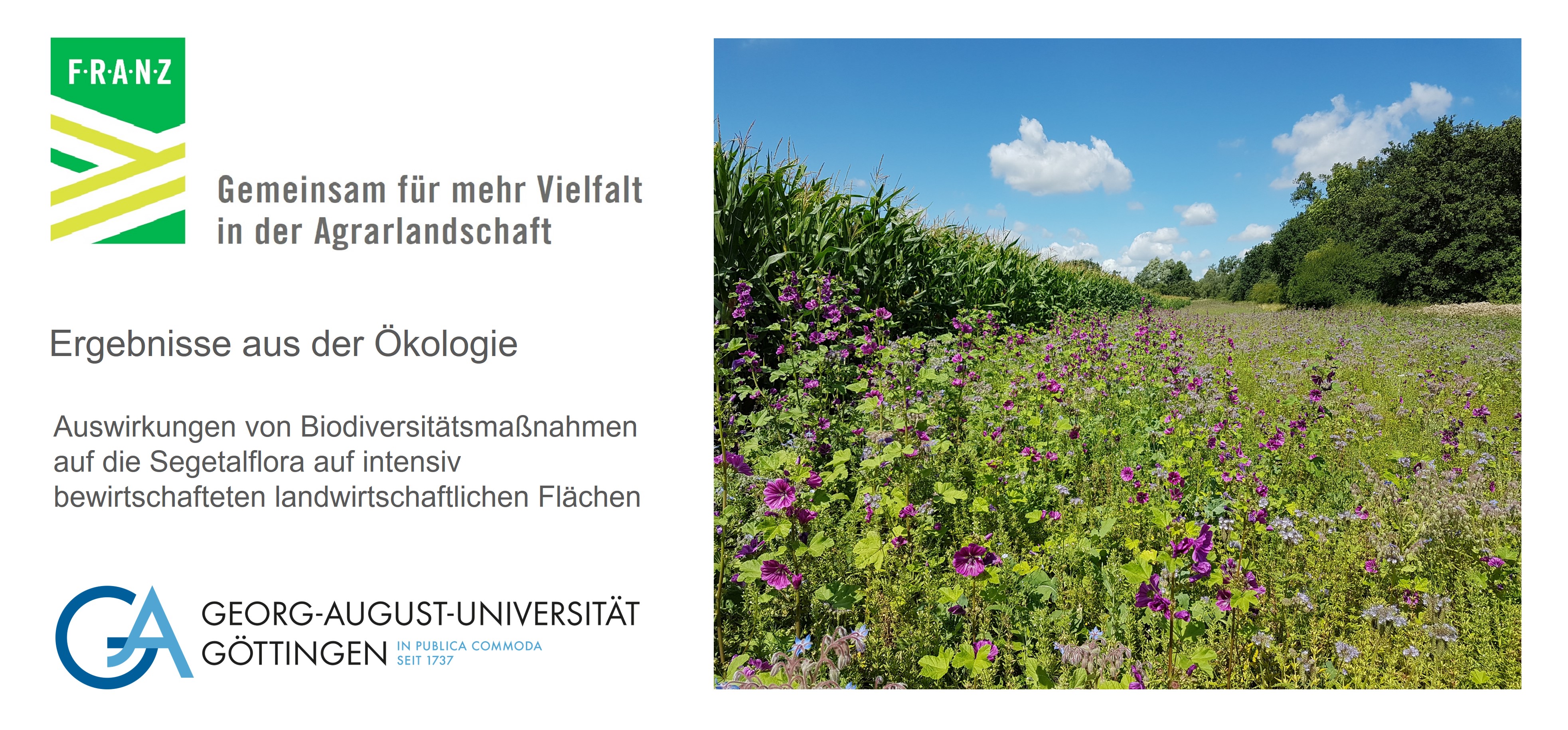 Unter dem Titel „Auswirkungen von Biodiversitätsmaßnahmen auf die Segetalflora auf intensiv bewirtschafteten landwirtschaftlichen Flächen“ veröffentlichen Dr. Laura M.E. Sutcliffe und Prof. Dr. Christoph Leuschner von der Universität Göttingen Ergebnisse aus der ökologischen Begleitforschung bezüglich Maßnahmeneffekte auf die Vegetation. Die wissenschaftlichen Untersuchungen der F.R.A.N.Z.-Maßnahmen zeigen, dass ein deutlicher Anstieg in der Deckung wie auch in der Diversität von Ackerwildkrautarten im intensiven Ackerbau erreicht werden kann – vorausgesetzt diese sind mit der Landwirtschaft abgestimmt.
