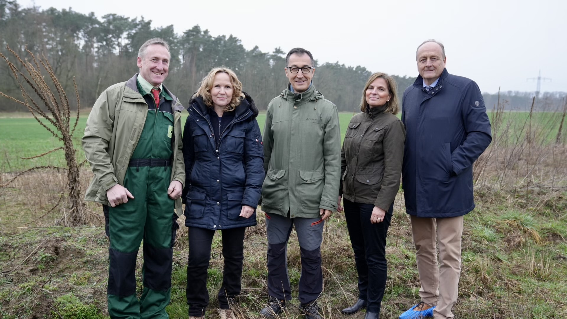 Betriebsleiter Peter Kaim, Bundesumweltministerin Steffi Lemke, Bundeslandwirtschaftsminister Cem Özdemir, Vorständin der Umweltstiftung Michael Otto Claudia Bühler und Präsident des Deutschen Bauernverbands Joachim Rukwied