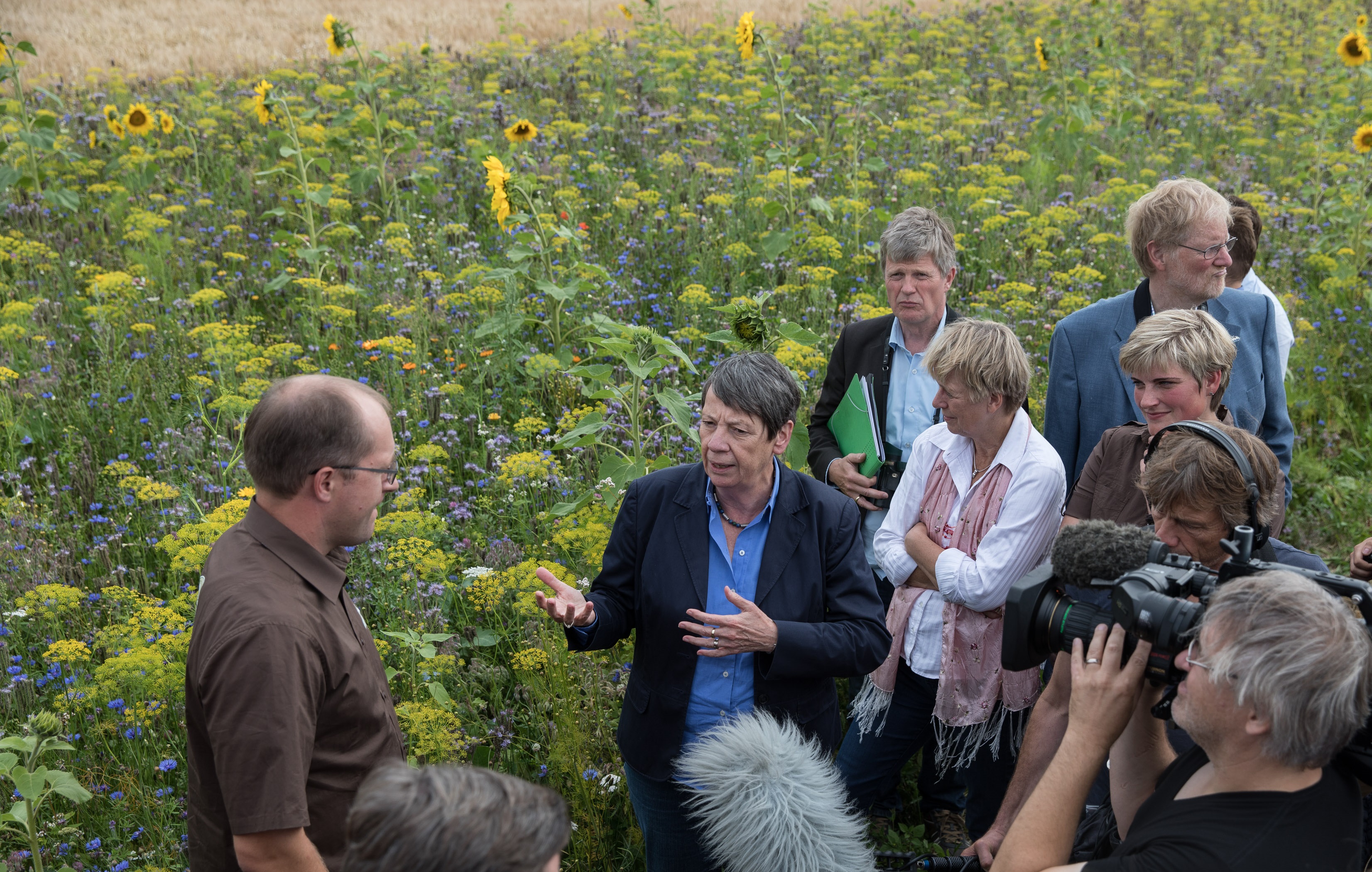 Anlässlich ihrer Sommerreise besuchte Bundesumweltministerin Barbara Hendricks den F.R.A.N.Z.-Demonstrationsbetrieb in der Lüneburger Heide. Begleitet wurde sie von zahlreichen Journalisten, Vertretern des Ministeriums sowie Bundes- und Landespolitikern. Der rund 220 ha große Ackerbaubetrieb der Familie Hartmann hat im ersten Projektjahr verschiedene Maßnahmen zur Erhaltung und Förderung der Biodiversität in der Agrarlandschaft angelegt, darunter Blühstreifen, Feldlerchenfenster mit Erbseneinsaat und Extensivgetreide mit Untersaat. Betriebsleiter Jochen Hartmann erklärte zusammen mit Betriebsbetreuer Björn Rohloff von der Stiftung Kulturlandpflege in Niedersachsen und Hermann Hötker vom Michael-Otto-Institut im NABU, welche Zielarten von diesen Maßnahmen jeweils profitieren und was bei der Anlage und Pflege der Maßnahmenflächen zu beachten ist. Dabei wurden auch die politischen Rahmenbedingungen diskutiert.Die Pressemitteilung zum Download finden Sie hier.
