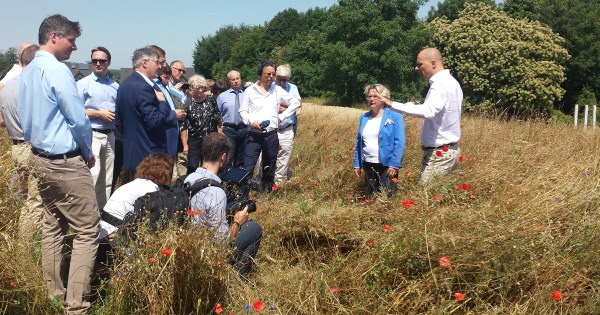 Die diesjährige Sommerreise führte Bundesumweltministerin Svenja Schulze zum F.R.A.N.Z.-Demonstrationsbetrieb in die Kölner Bucht. Gemeinsam mit Beate Jessel, Präsidentin des Bundesamtes für Naturschutz (BfN), Vertretern des Umweltministeriums und BfN sowie zahlreichen Journalisten besichtigte sie die auf dem Gut Neu-Hemmerich in der Kölner Bucht angelegten Biodiversitätsmaßnahmen. Der rund 380 ha große Ackerbaubetrieb hat verschiedene Maßnahmen zur Erhaltung und Förderung der Biodiversität in der Agrarlandschaft angelegt, darunter Blühstreifen, Extensivgetreide mit Ernteverzicht und Sommergetreide mit blühender Untersaat. Der vor Ort zuständige Betriebsberater Dr. Patrick Lind von der FlächenAgentur Rheinland erläuterte der Ministerin die Anlage einer Blühfläche und ging dabei auch auf die wirtschaftlichen Rahmenbedingungen und den enormen Flächendruck in der Kölner Bucht ein. Der Besuch führte zudem an der Maßnahme Extensivgetreide vorbei.