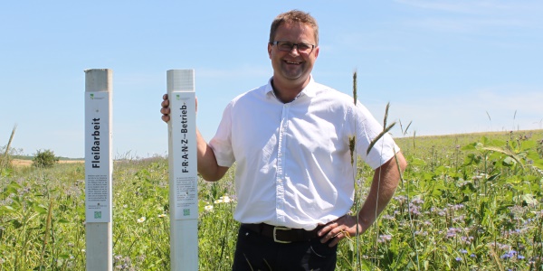Landwirt Jürgen Maurer neben zwei Infopfosten eines angelegten mehrjährigen Blüstreifens