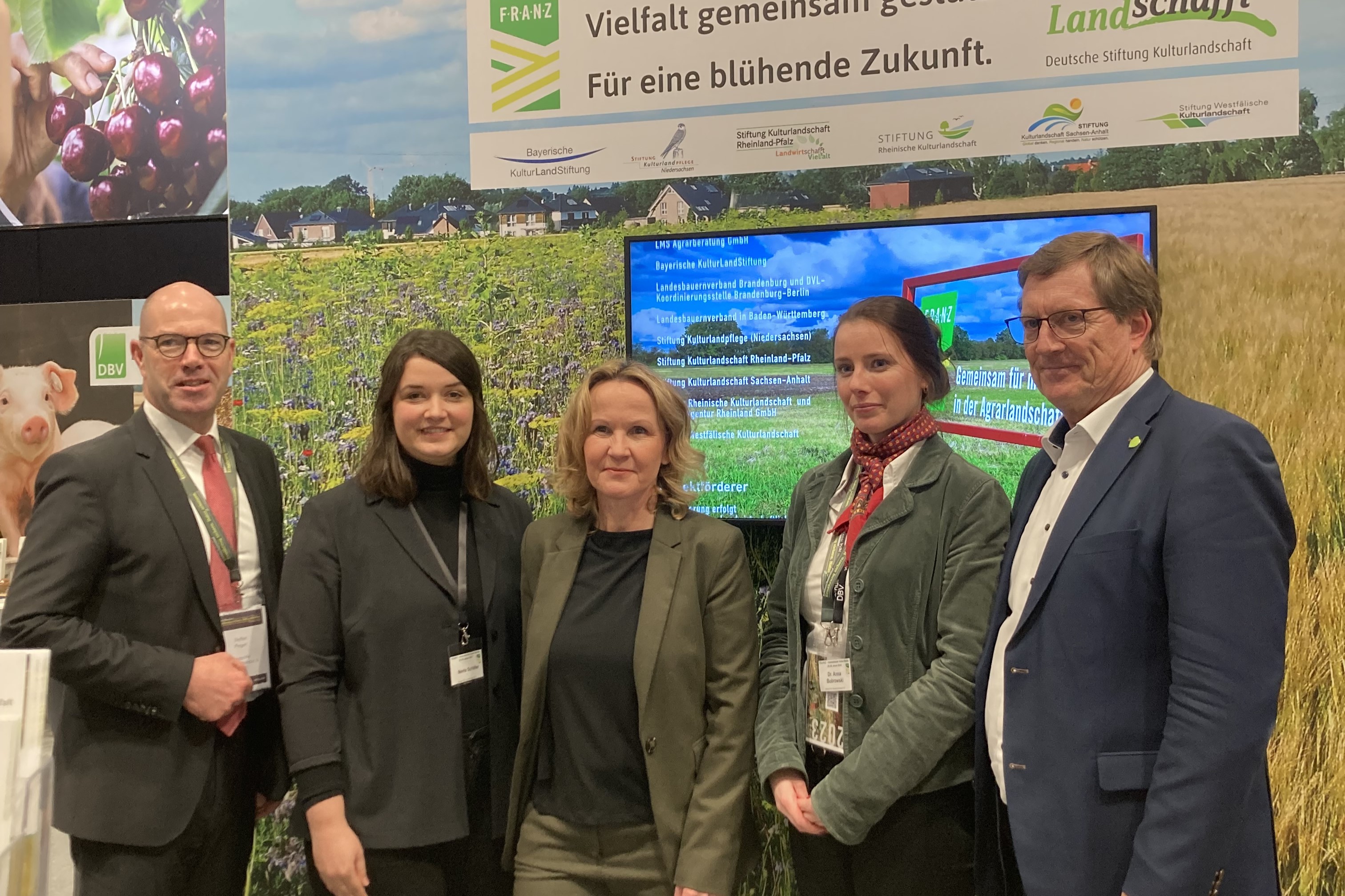 Neben der Bekanntmachung des Projektes ist auch der Austausch mit politischen Entscheidungsträgerinnen und Entscheidungsträgern verschiedener Ebenen (Land-, Bund-, und EU-Ebene) besonders wertvoll, um die Erkenntnisse aus bisher acht Jahren Laufzeit zu kommunizieren. Im Rahmen der Grünen Woche boten sich hierfür zahlreiche Möglichkeiten. Hervorgehoben wurde dabei die ökologische Wirksamkeit und Praxistauglichkeit der F.R.A.N.Z.-Maßnahmen und die Notwendigkeit einer entsprechenden Honorierung.