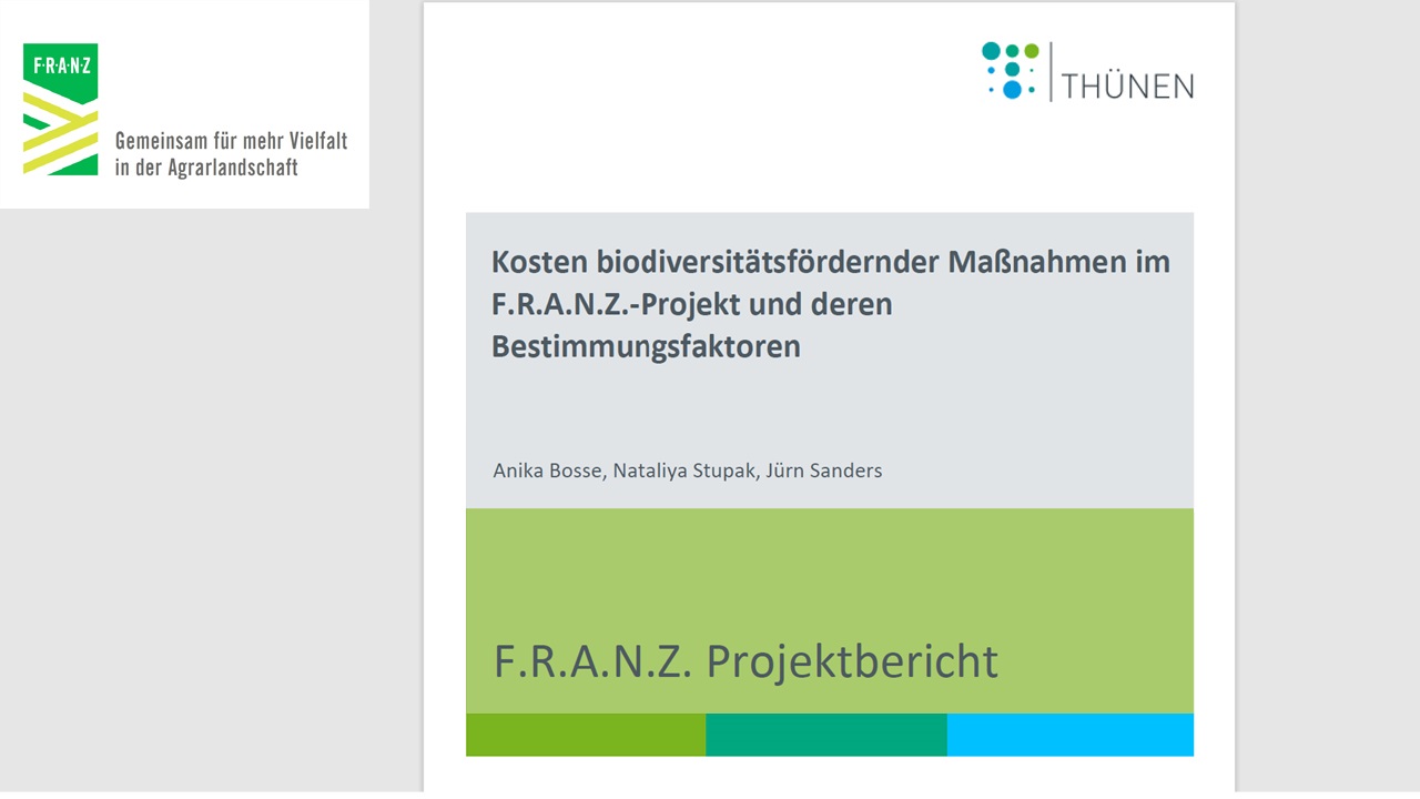 Der aktuelle Bericht des Thünen-Instituts für Betriebswirtschaft „Kosten biodiversitätsfördernder Maßnahmen im F.R.A.N.Z.-Projekt und deren Bestimmungsfaktoren“ gibt einen Überblick über die Maßnahmenkosten der zehn Demonstrationsbetriebe von 2017 bis 2020.