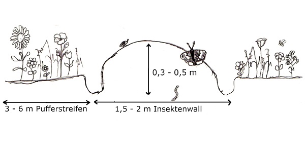 Insektenwälle sind bis zu 2 Meter breit und bis zu einem halben Meter hoch. Um ein möglichst breites Nahrungsangebot anzubieten und verschiedene Organismengruppen zu fördern, empfiehlt sich die Anlage von drei Meter breiten Blühstreifen als Puffer zur Feldfrucht. Einen besonders hohen Mehrwert für die Natur bietet die Maßnahme, wenn sie in der Feldmitte angelegt wird. Ein Mähen bzw. Mulchen im Spätsommer sorgt für einen niedrigen Unkrautdruck, so dass sich weniger dominante Unkräuter durchsetzen.